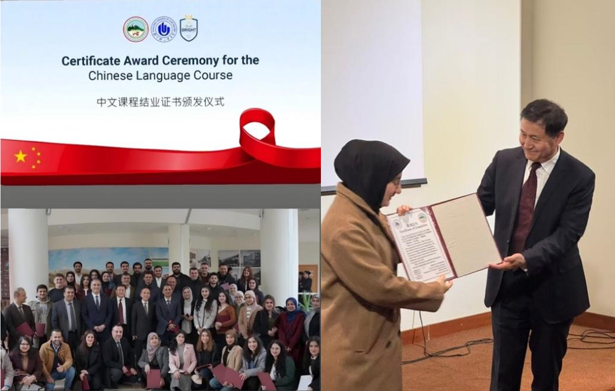 近日,外国语学院与伊拉克院校联合开展的线上中文教学项目“丝路伊语”培训课结业仪式在伊拉克苏莱曼尼大学媒体中心隆重举行。中国驻埃尔比勒总领馆总领事刘军、苏莱曼尼大学校领导科萨尔出席仪式,为优秀学员颁发证书,共同见证中伊教育交流重要成果。